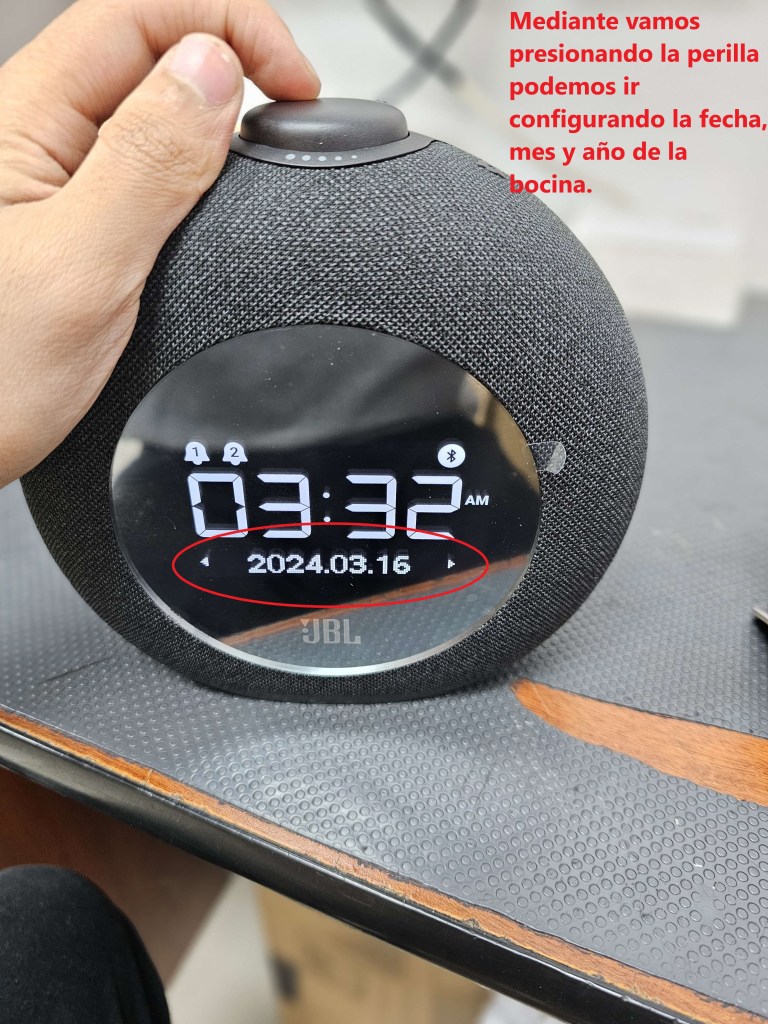 Al presionar nuevamente la perilla, esto nos permitirá cambiar la fecha que nos muestra la pantalla de la bocina, secuencialmente al presionar la perilla nos dejará cambiar día, fecha y año.