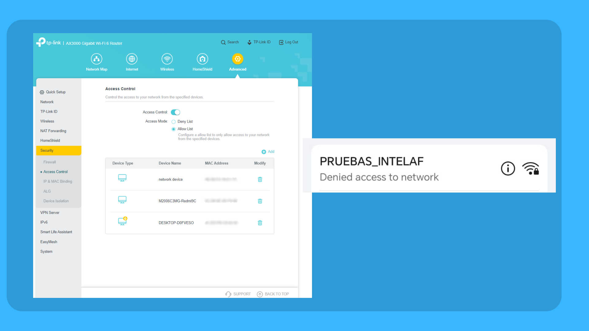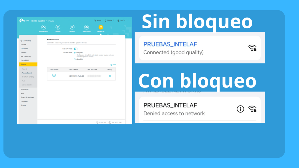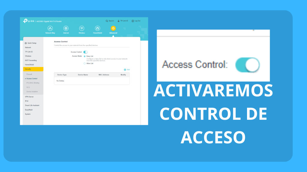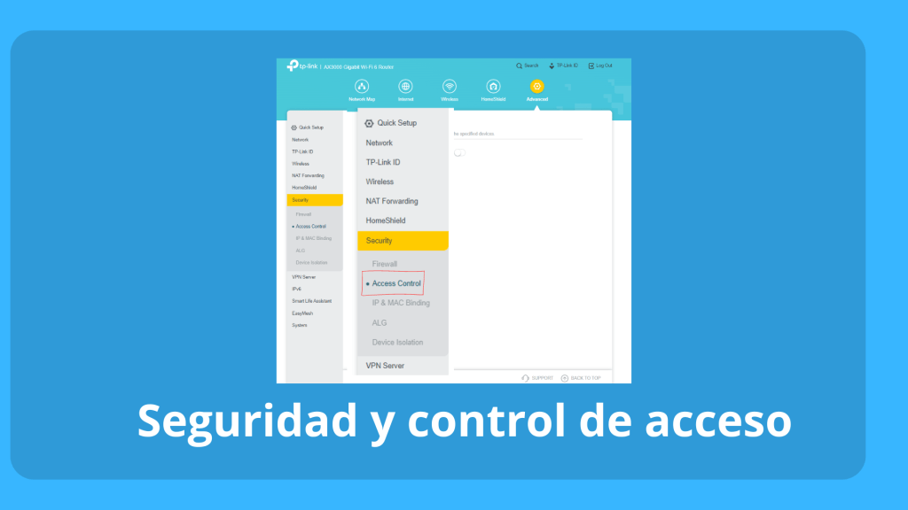 A continuación, realizaremos una configuración de nuestro Router TP-Link AX53 para poder gestionar y aumentar la seguridad de nuestros usuarios en la red, realizando una configuración de 2 tipos de opciones que nos permite realizar el dispositivo, ¨Accesos autorizados¨, ¨Accesos denegados¨.