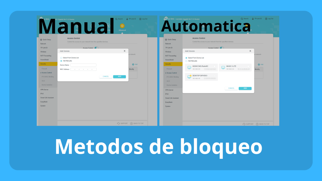 En el listado de ¨Deny List¨, tendremos que seleccionar la opción ¨ADD¨ para poder agregar usuarios a la lista de bloqueos, esto a base de 2 métodos diferentes, los cuales puede ser de manera manual o automática, La manera más cómoda es la automática, debido a que detecta los dispositivos con sus IP y sus direccionas MAC del dispositivo. Al contrario de la versión manual, que debes de conocer la dirección MAC del dispositivo para poder bloquearlo. En ambas opciones, tras digitar o seleccionar los dispositivos a denegar el acceso, tendremos que seleccionar el botón ADD para guardar los cambios, los cuales tardan entre 30 segundos a 1 minuto en aplicarse.