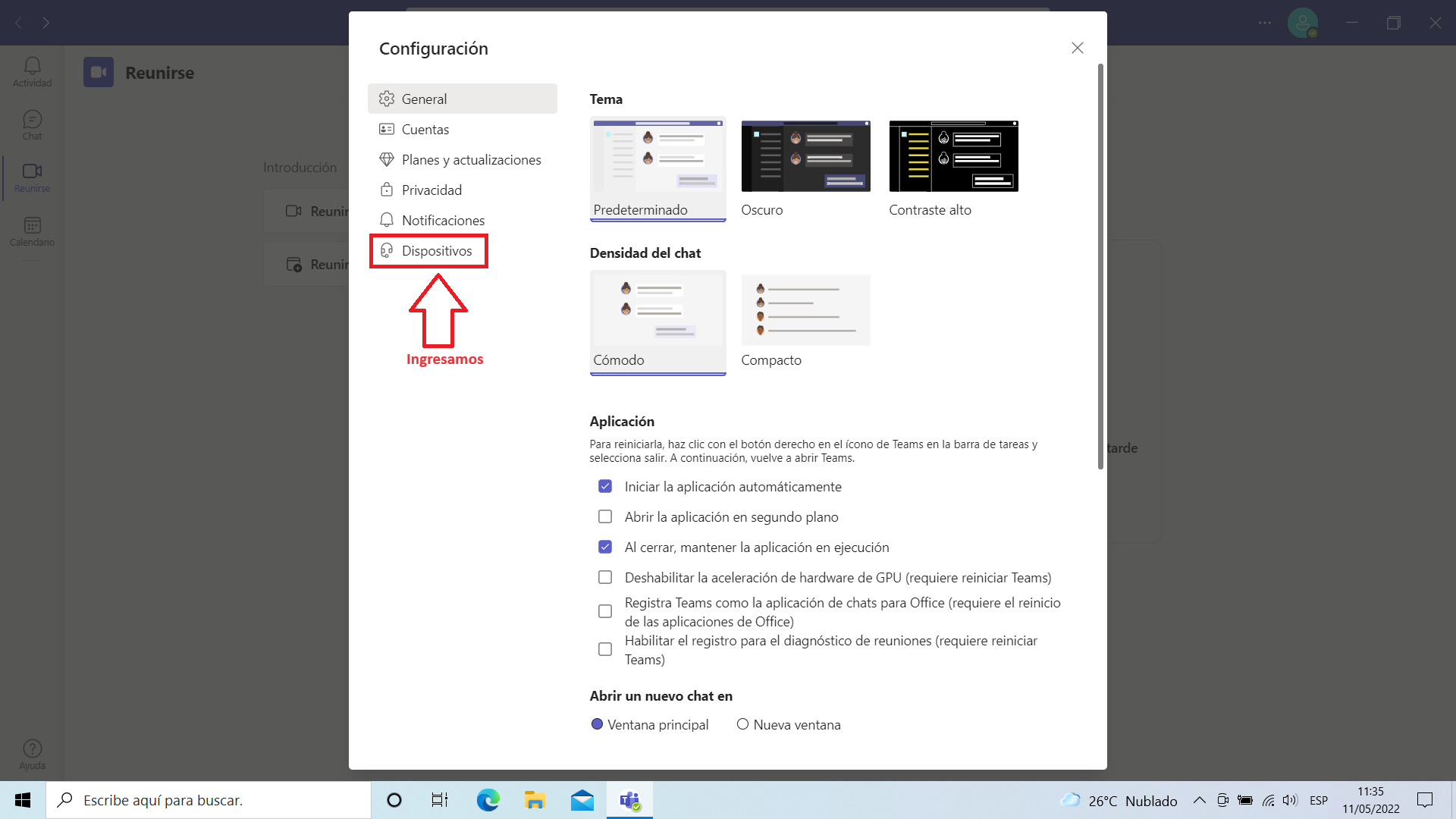 Dentro del menú de Configuración de Microsoft Teams, ingresá a la sección Dispositivos.