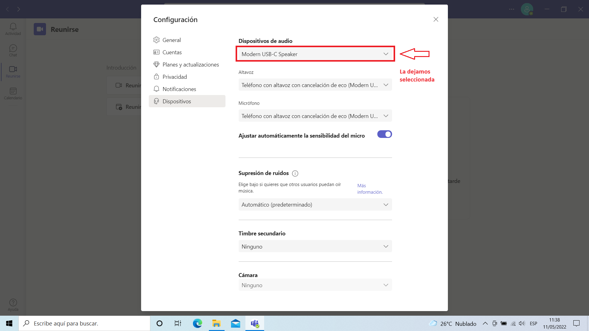 Paso 4: Seleccionar la bocina Microsoft USB-C 8KZ-00001 como dispositivo principal