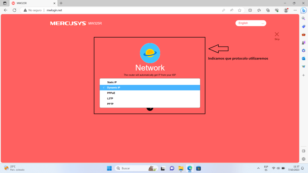 Después de crear la contraseña de administrador, el Mercusys N Router MW325R te pedirá elegir el tipo de conexión a internet que vas a utilizar.