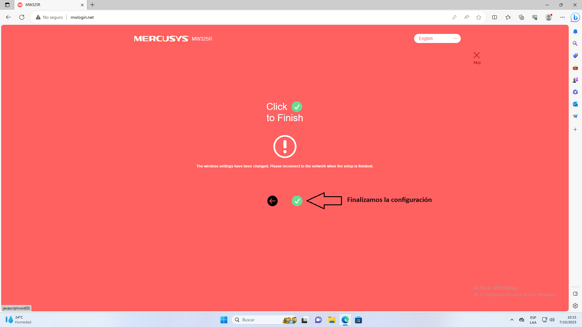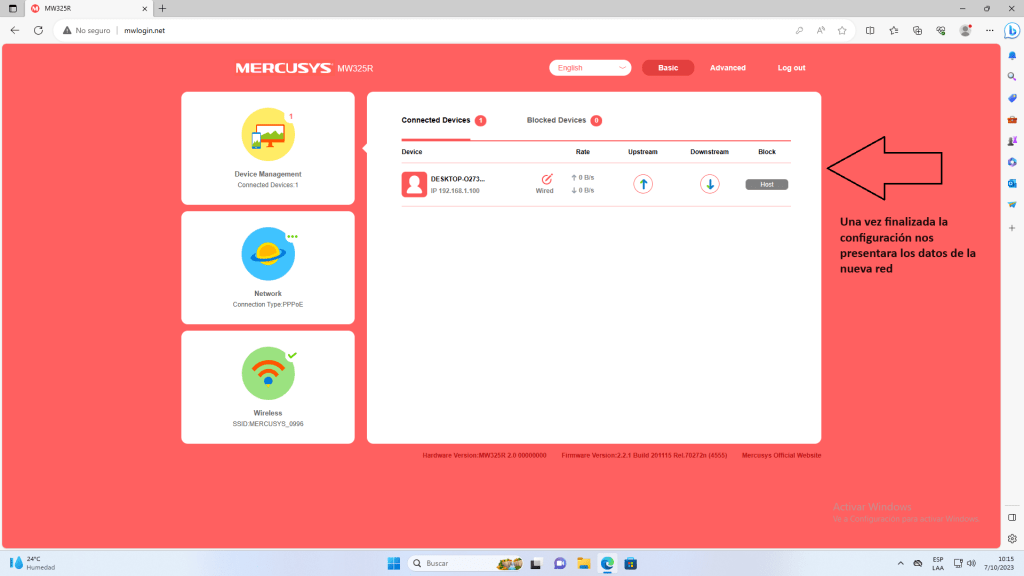 Al finalizar la instalación, el Mercusys N Router MW325R mostrará un resumen de la configuración. En esta pantalla podrás visualizar: