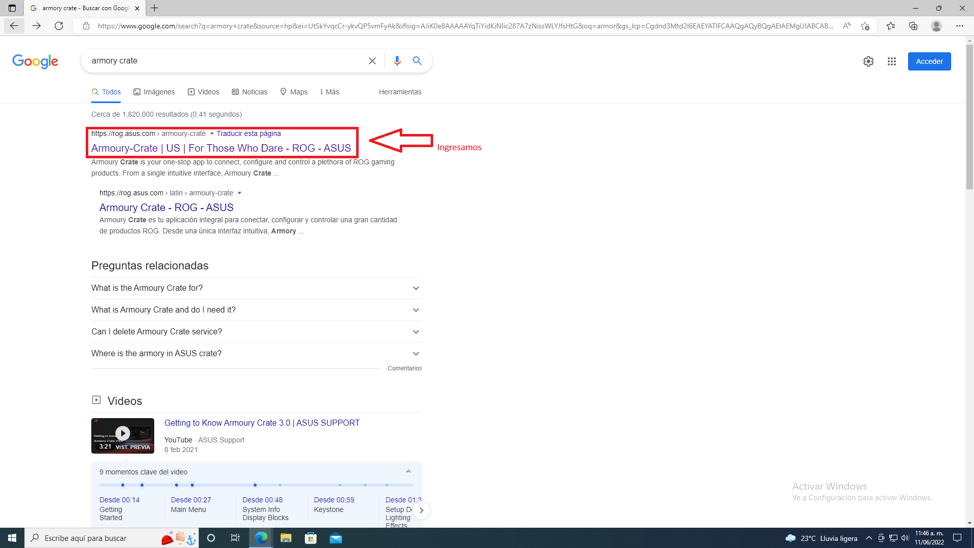 Abrí tu navegador de internet (Chrome, Edge, Firefox, etc.) y dirigite a la página oficial de Asus para descargar la aplicación Armoury Crate.