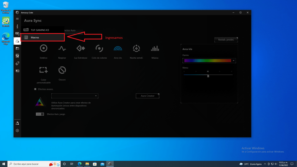 Dentro de la aplicación Armoury Crate, ingresá a la sección Aura Sync para configurar la iluminación RGB de tu teclado Asus TUF Gaming K3 RGB Red. Desde aquí podrás: