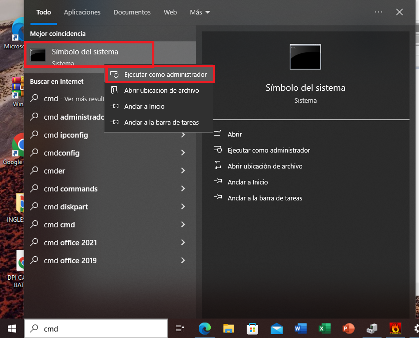 - Hacé clic derecho sobre el resultado Símbolo del sistema.
