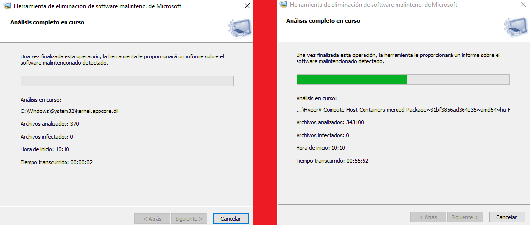 Mientras se ejecuta el análisis completo con la herramienta MRT de Microsoft, en la ventana de la aplicación podrás visualizar en tiempo real: