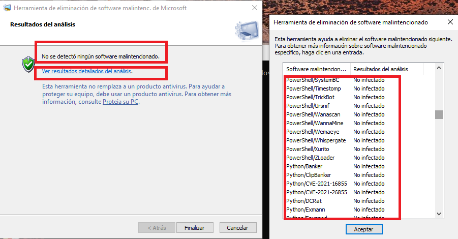 - Si no se detecta software malicioso, el informe confirmará que tu sistema está limpio.