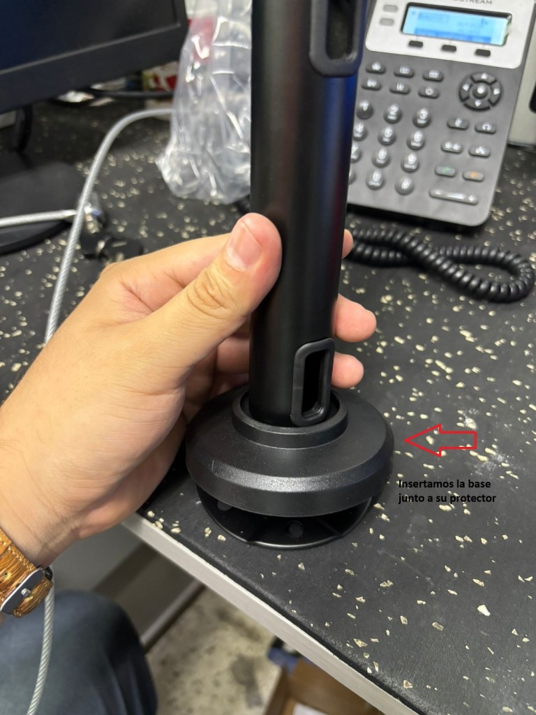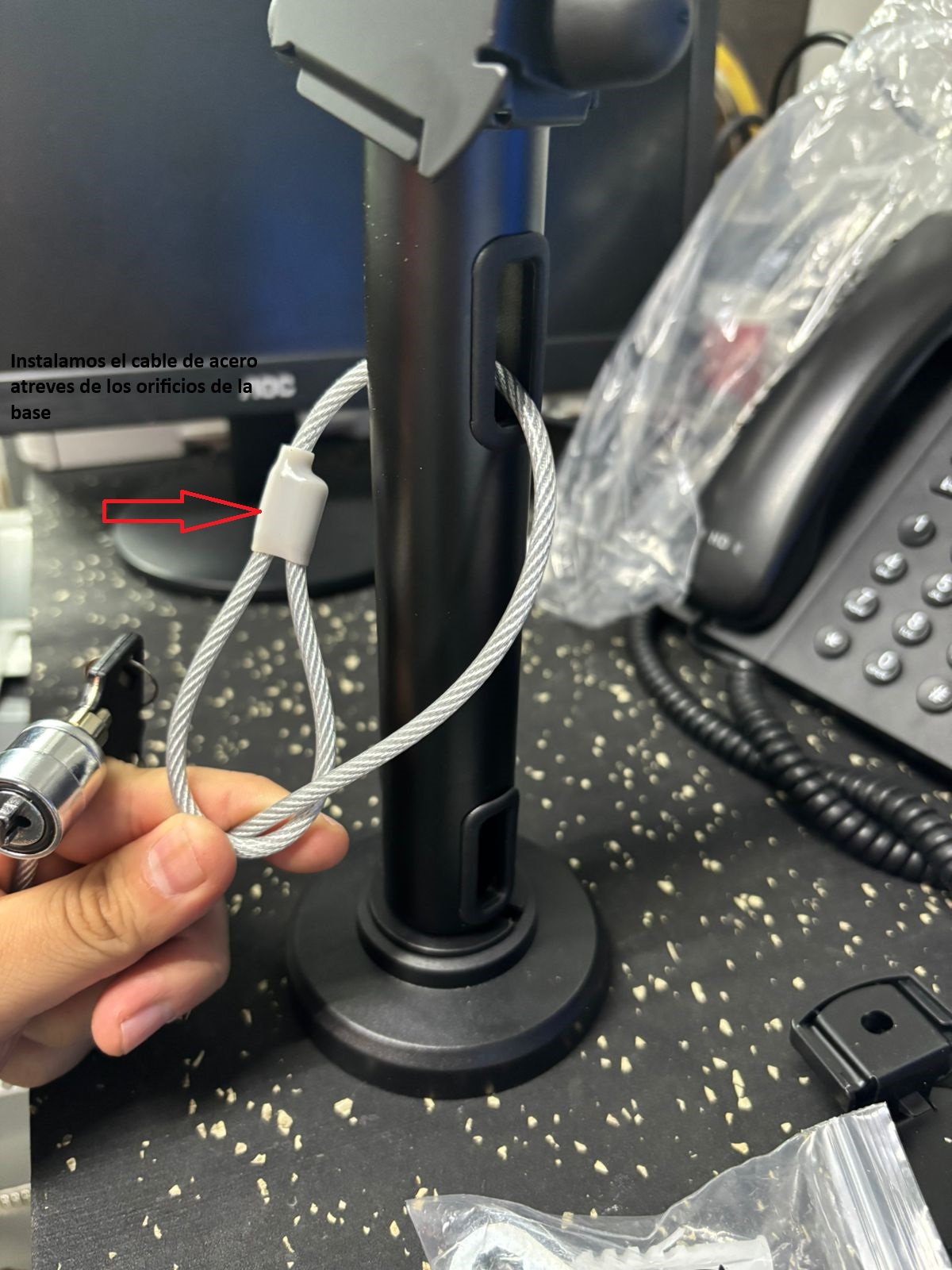 Insertá el cable de acero a través de los orificios de la base del stand Manhattan 462112. Este mecanismo permite asegurar la tablet al soporte, brindando mayor protección contra movimientos accidentales o intentos de sustracción.