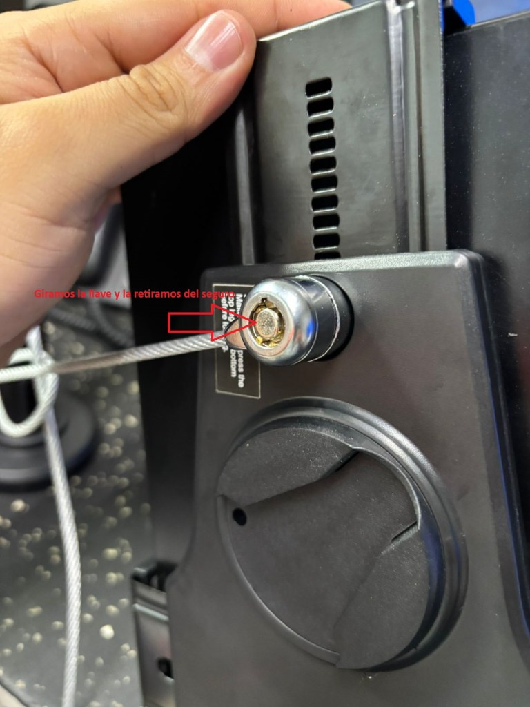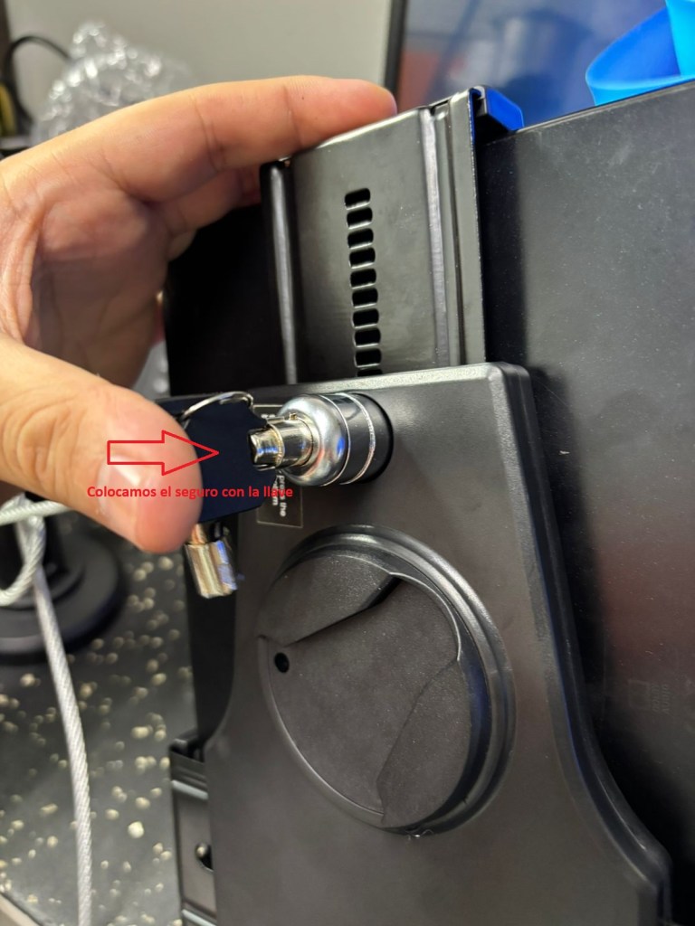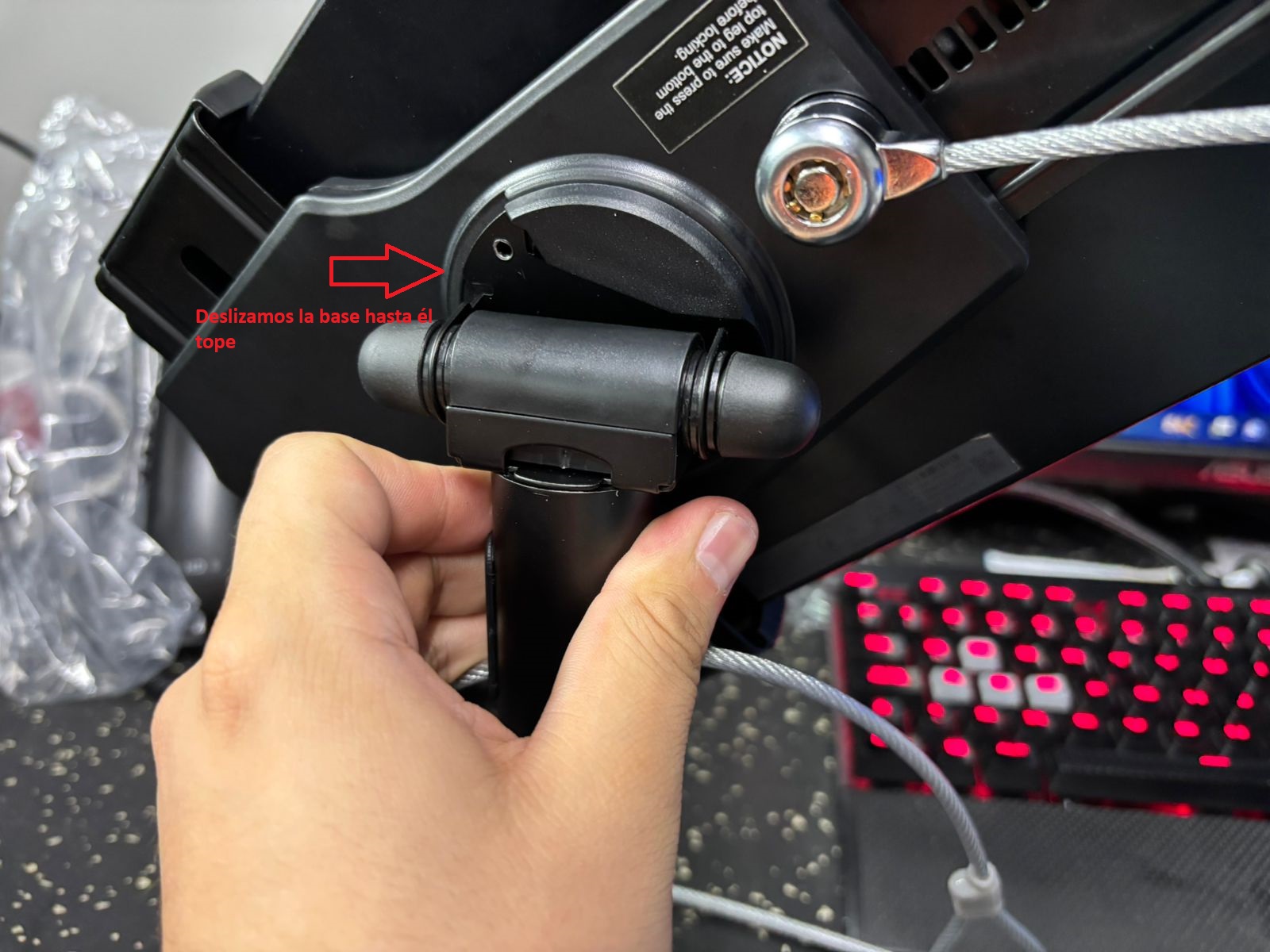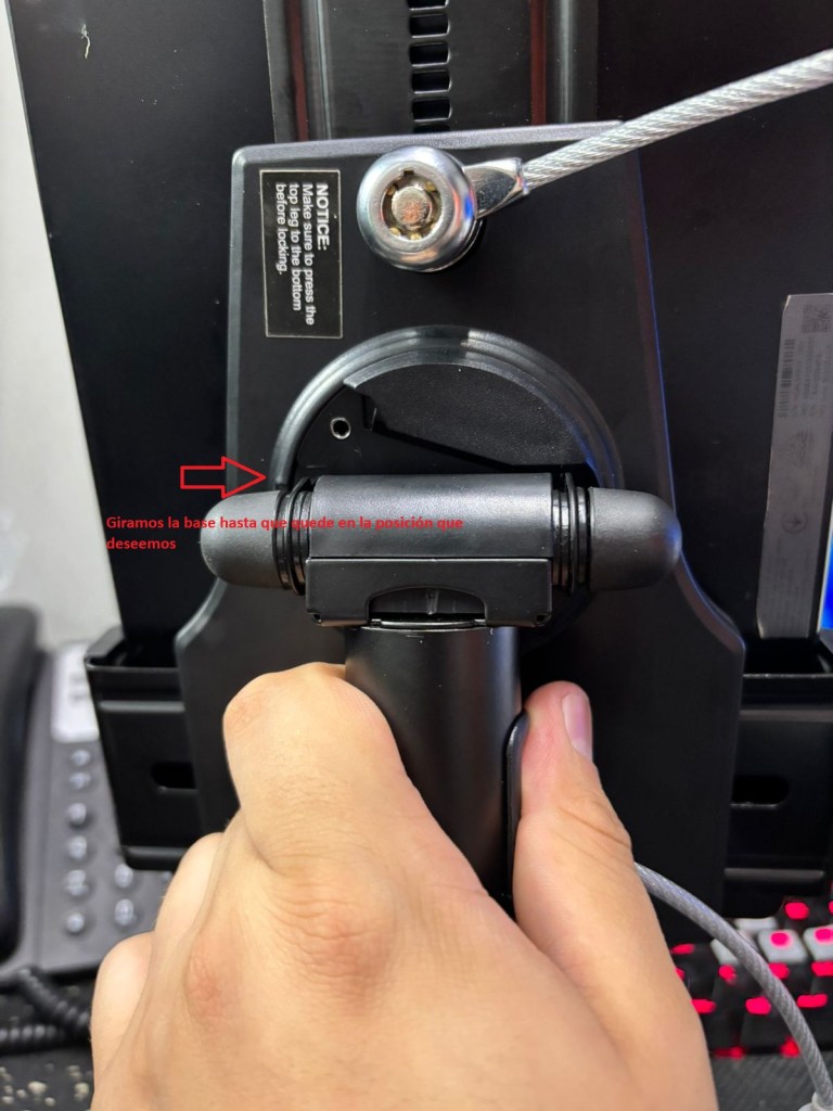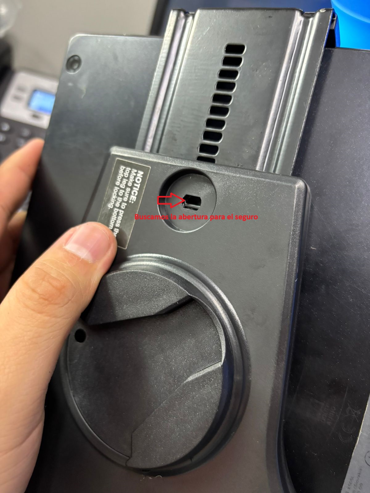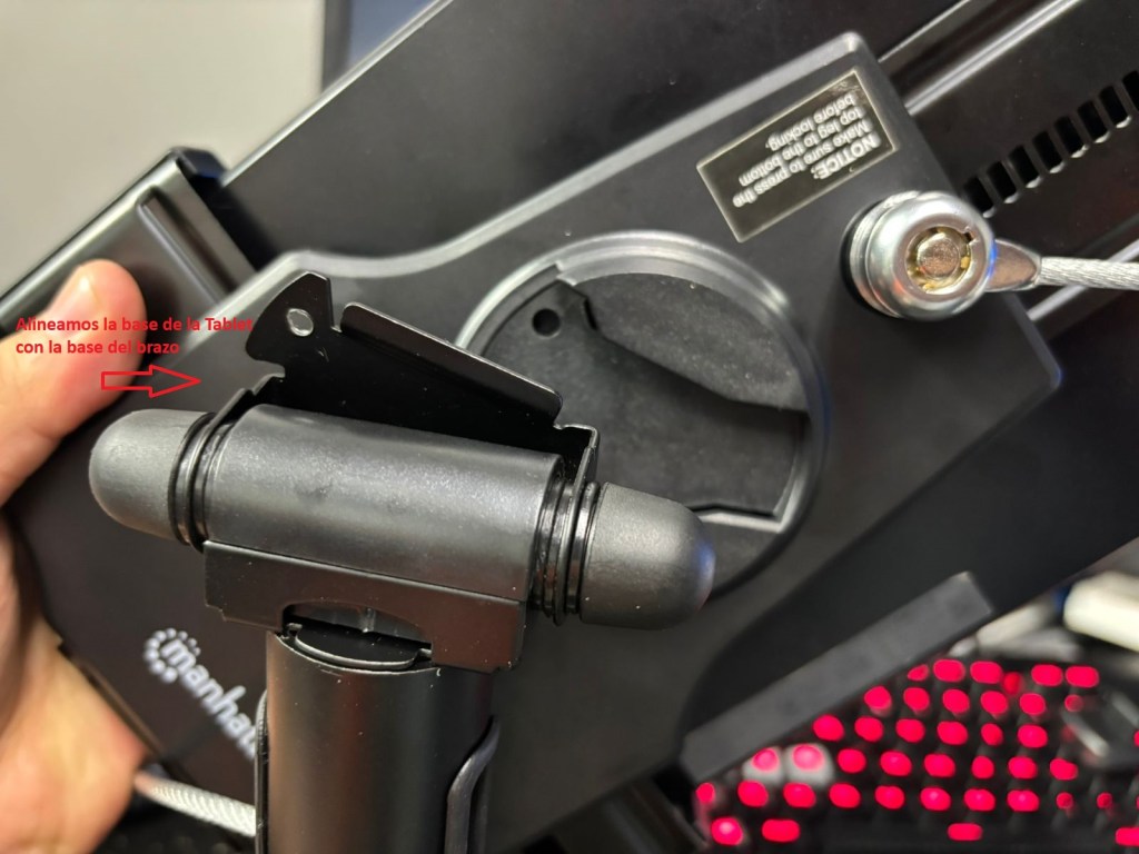 Una vez que la tablet esté instalada en el stand Manhattan 462112, insertá el seguro en la parte trasera de la base. Este paso refuerza la fijación del dispositivo y brinda una protección adicional contra movimientos o caídas accidentales.