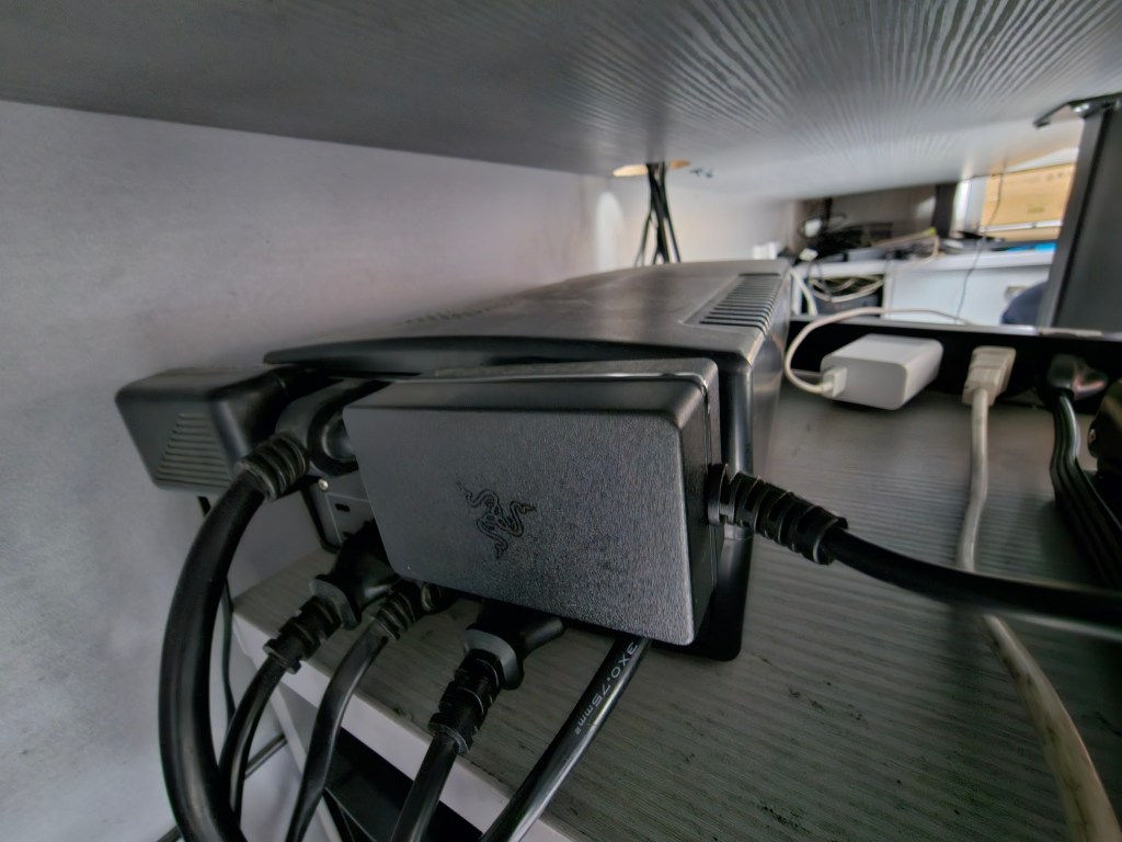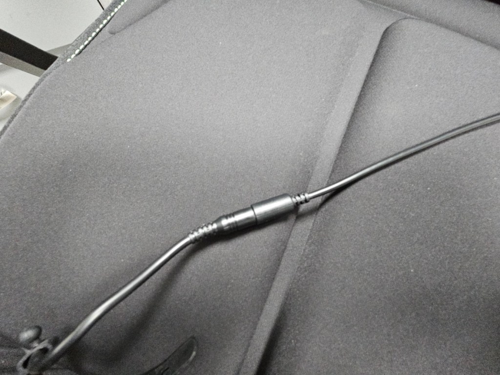 Con el cojín ya ajustado a tu silla, procedé a conectar el adaptador de corriente del Razer Freyja al tomacorriente más cercano. Esto garantizará que el cojín tenga la energía necesaria para sincronizarse con el software y activar las funciones de vibración e inmersión.