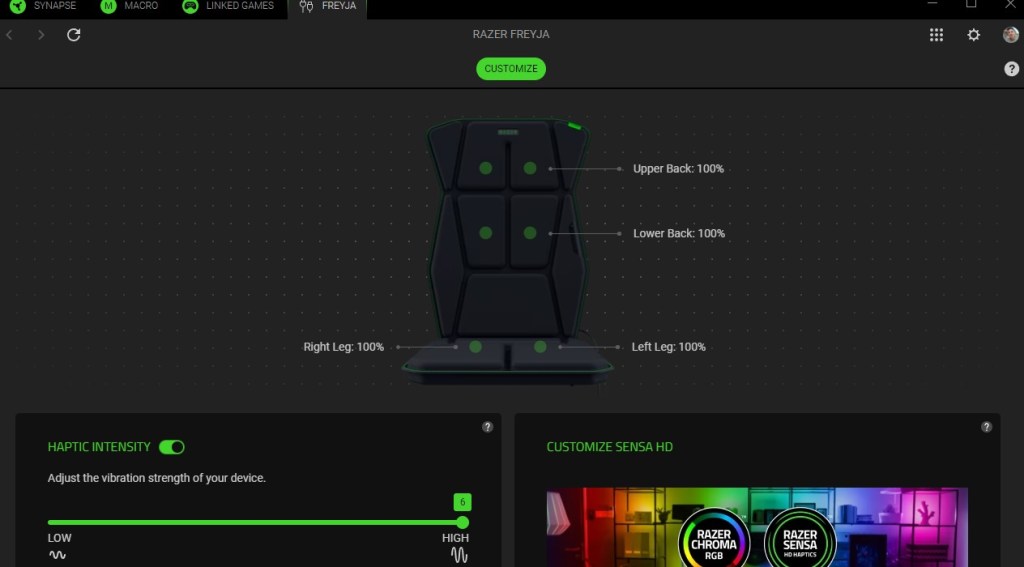 Con el software del cojín Razer Freyja ya instalado, accedé a los ajustes de configuración desde tu computadora. En esta sección podrás modificar la intensidad de vibración y adaptarla a tu gusto, ya sea para videojuegos, música o películas.